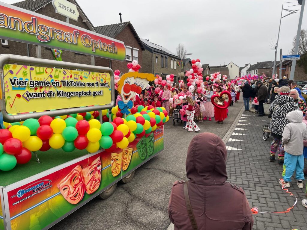 De kinderoptocht moest het dit jaar doen zonder de zon, maar met een koude, soms snijdende wind. Met een temperatuur van net 1 graad en soms zelfs wat ‘witte confetti’ in de lucht. Dit was een kinderoptocht voor de ‘die-hards’, maar die waren er gelukkig genoeg. Er werd gezongen en gesprongen (om warm te blijven) en ook de kijkers langs de kant deden mee.